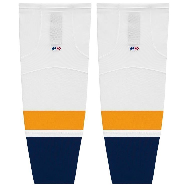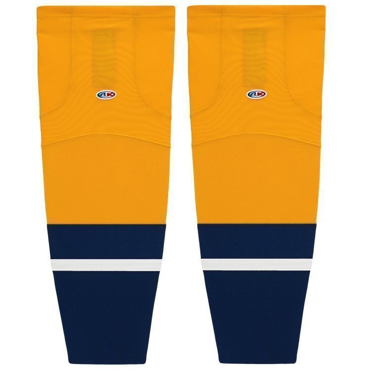 Nashville Predators air knit hockey socks in home and away styles. Nashville Predators air-knit hockey socks in stock in adult, intermediate and youth sizes in authentic Predators blue, gold and white sewn striping. Athletic Knit HS2100 air-knit hockey socks feature pro weight edge style air knit fabric with Dry-Flex wicking stretch panels and two sewn Velcro tabs.