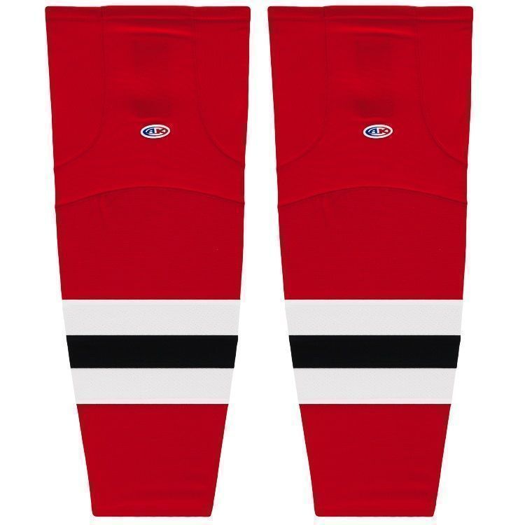 New Jersey Devils air knit hockey socks in home and away styles. New Jersey Devils air-knit hockey socks in stock in adult, intermediate and youth sizes in authentic Devils 2017-18 red and black sewn striping. Athletic Knit HS2100 air-knit hockey socks feature pro weight edge style air knit fabric with Dry-Flex wicking stretch panels and two sewn Velcro tabs.