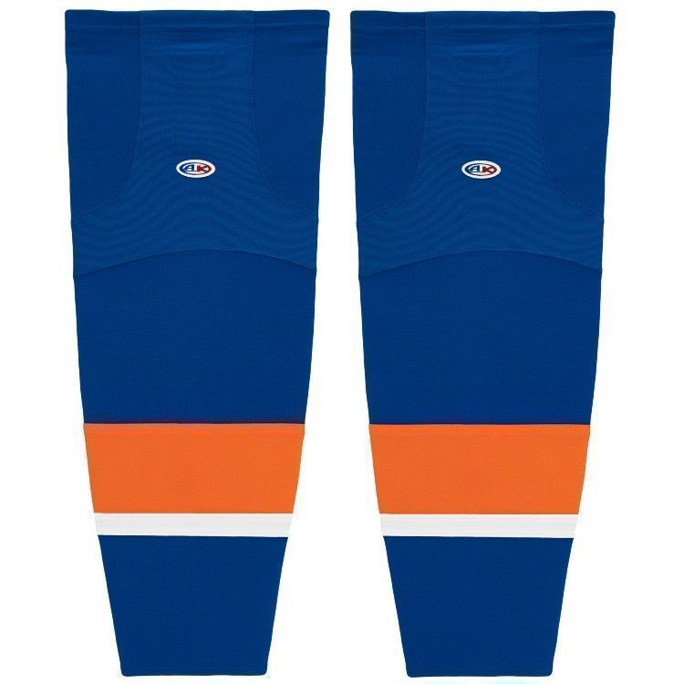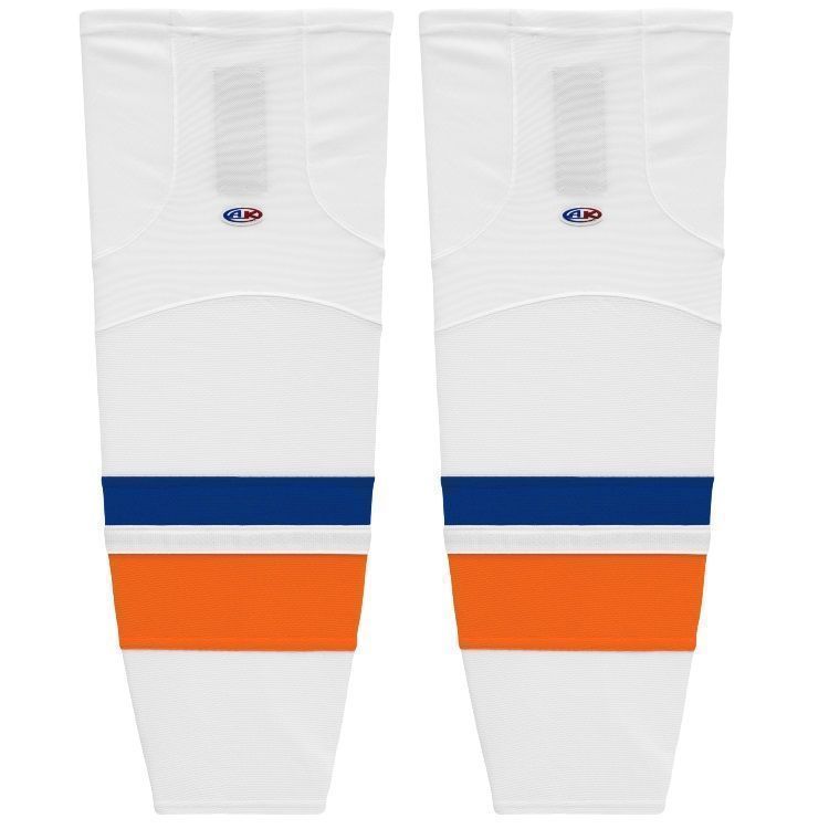 NY Islanders air knit hockey socks in home and away styles. NY Islanders air-knit hockey socks in stock in adult, intermediate and youth sizes in authentic Islanders royal, orange and white sewn striping. Athletic Knit HS2100 air-knit hockey socks feature pro weight edge style air knit fabric with Dry-Flex wicking stretch panels and two sewn Velcro tabs.