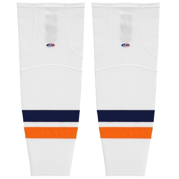 NY Islanders old air knit hockey socks in home and away styles. NY Islanders air-knit hockey socks in stock in adult, intermediate and youth sizes in authentic Islanders old navy, orange and white sewn striping. Athletic Knit HS2100 air-knit hockey socks feature pro weight edge style air knit fabric with Dry-Flex wicking stretch panels and two sewn Velcro tabs.