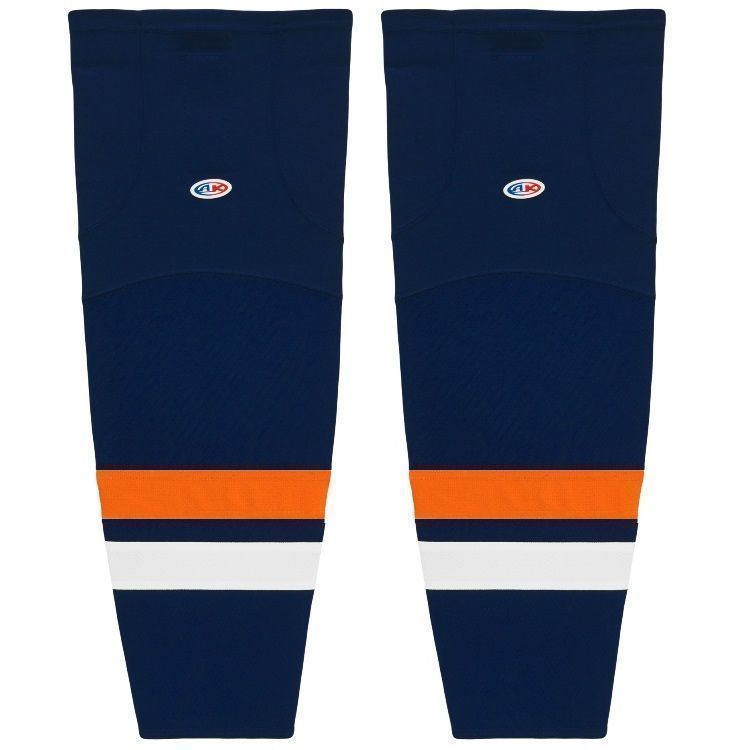 NY Islanders old air knit hockey socks in away blue. NY Islanders air-knit hockey socks in stock in adult, intermediate and youth sizes in authentic Islanders old navy, orange and white sewn striping. Athletic Knit HS2100 air-knit hockey socks feature pro weight edge style air knit fabric with Dry-Flex wicking stretch panels and two sewn Velcro tabs.