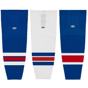 NY Rangers air knit hockey socks in home and away styles. NY Rangers air-knit hockey socks in stock in adult, intermediate and youth sizes in authentic Rangers royal, red and white sewn striping. Athletic Knit HS2100 air-knit hockey socks feature pro weight edge style air knit fabric with Dry-Flex wicking stretch panels and two sewn Velcro tabs.