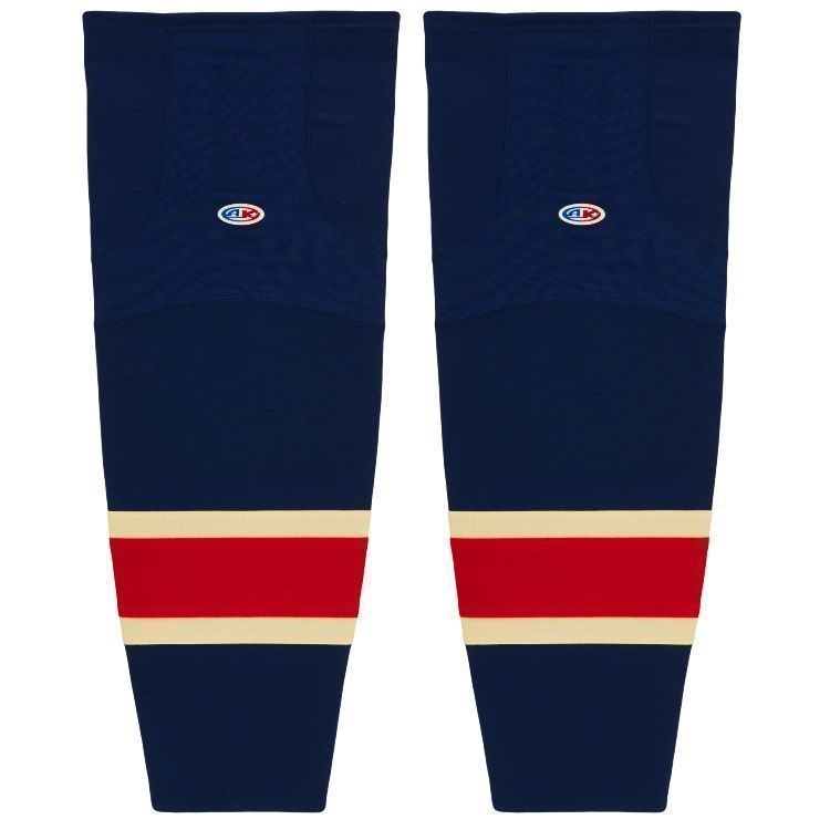 NY Rangers Winter Classic air knit hockey socks in authentic pattern worn during the 2012 New Years day game. NY Rangers Winter Classic air-knit hockey socks in stock in adult, intermediate and youth sizes in navy, creme and red sewn striping. Athletic Knit HS2100 air-knit hockey socks feature pro weight edge style air knit fabric with Dry-Flex wicking stretch panels and two sewn Velcro tabs.