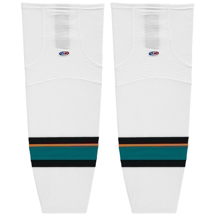 San Jose Sharks air knit hockey socks in home, away and 3rd styles. San Jose Sharks air-knit hockey socks in stock in adult, intermediate and youth sizes in authentic Sharks teal, black and white sewn striping. Athletic Knit HS2100 air-knit hockey socks feature pro weight edge style air knit fabric with Dry-Flex wicking stretch panels and two sewn Velcro tabs.