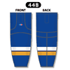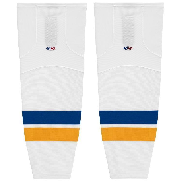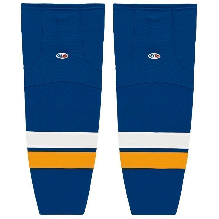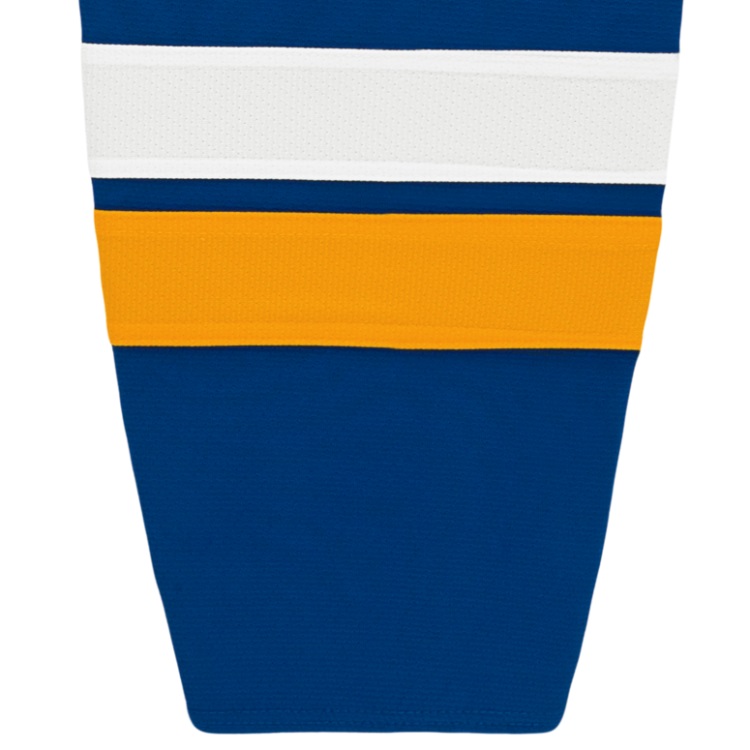 St. Louis Blues mesh hockey socks in home and away stripes. St. Louis Blues air-knit hockey socks in stock in adult, intermediate and youth sizes in Blues royal and gold sewn striping. Athletic Knit HS2100 air-knit hockey socks feature pro weight edge style air knit fabric with Dry-Flex wicking stretch panels and two sewn Velcro tabs.
