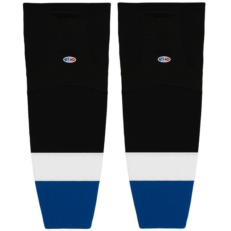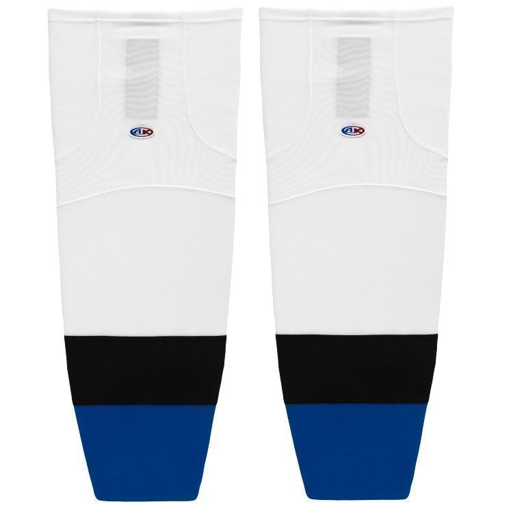 Tampa Bay Lightning old hockey socks in home and away stripes. Tampa Bay Lightning air-knit hockey socks in stock in adult, intermediate and youth sizes in old Lightning sewn striping. Athletic Knit HS2100 air-knit hockey socks feature pro weight edge style air knit fabric with Dry-Flex wicking stretch panels and two sewn Velcro tabs.