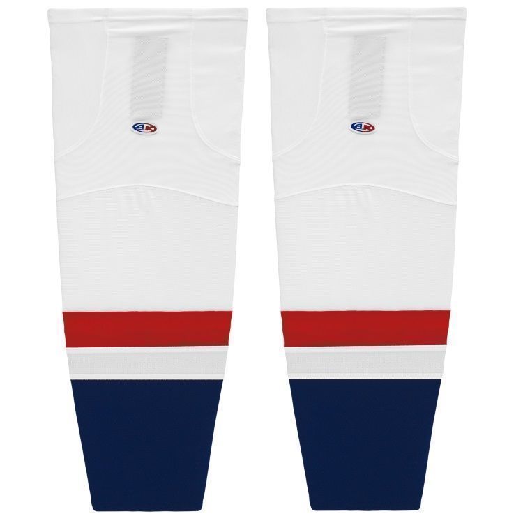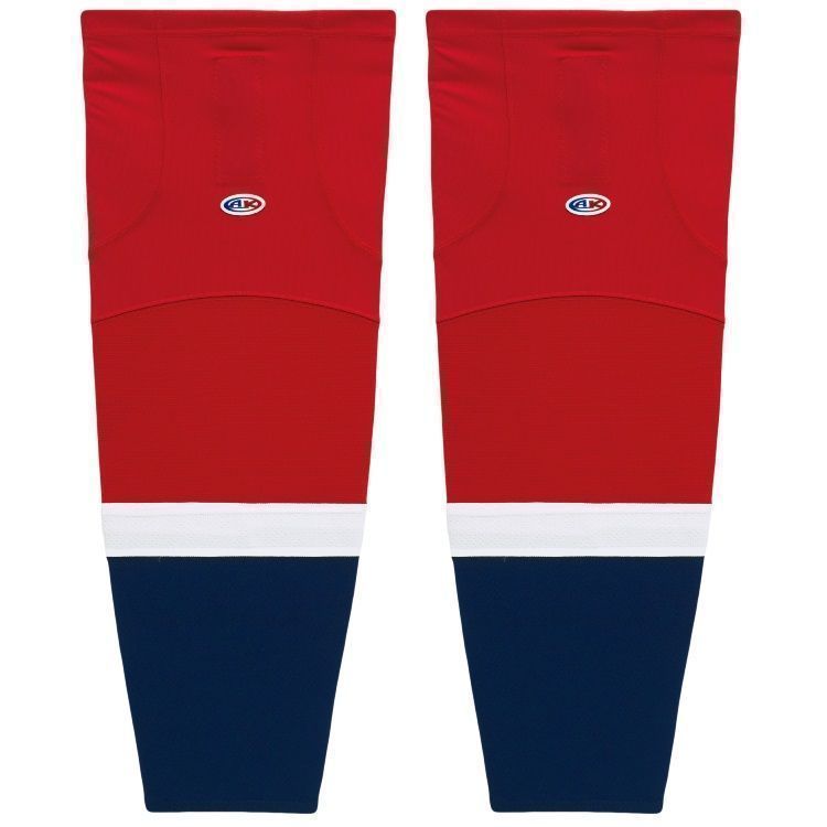 Washington Capitals air knit hockey socks in home and away stripes. Washington Capitals air-knit hockey socks in stock in adult, intermediate and youth sizes in authentic Capitals blue and red sewn striping. Athletic Knit HS2100 air-knit hockey socks feature pro weight edge style air knit fabric with Dry-Flex wicking stretch panels and two sewn Velcro tabs.