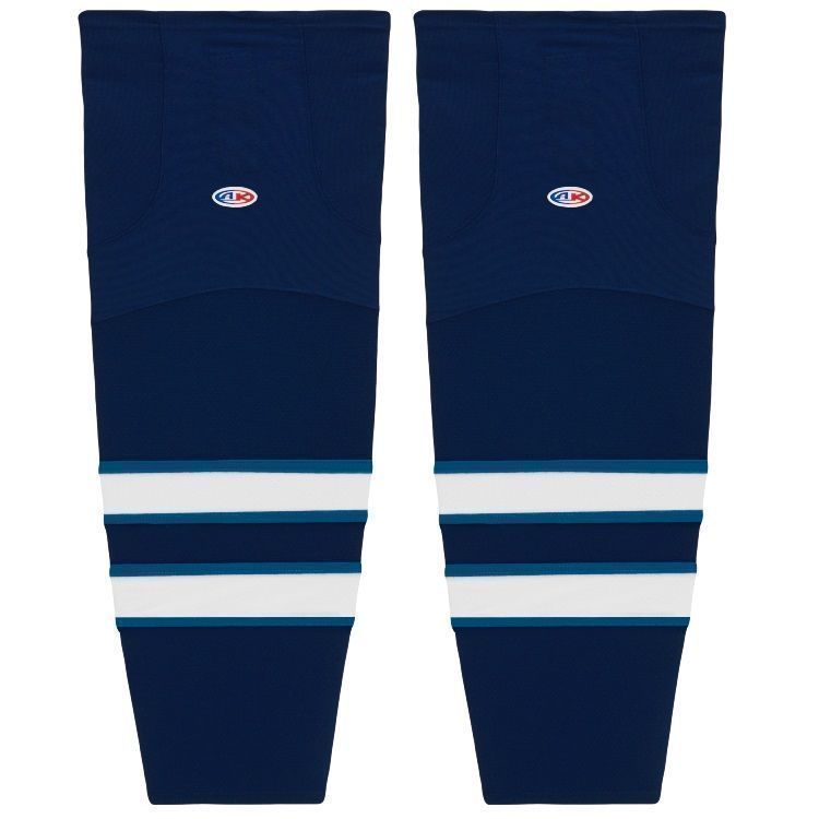 Winnipeg Jets air knit hockey socks in home and away styles. Winnipeg Jets mesh hockey socks in stock in adult, intermediate and youth sizes in authentic Jets blue, grey and white sewn striping. Athletic Knit HS2100 air-knit hockey socks feature pro weight edge style air knit fabric with Dry-Flex wicking stretch panels and two sewn Velcro tabs.