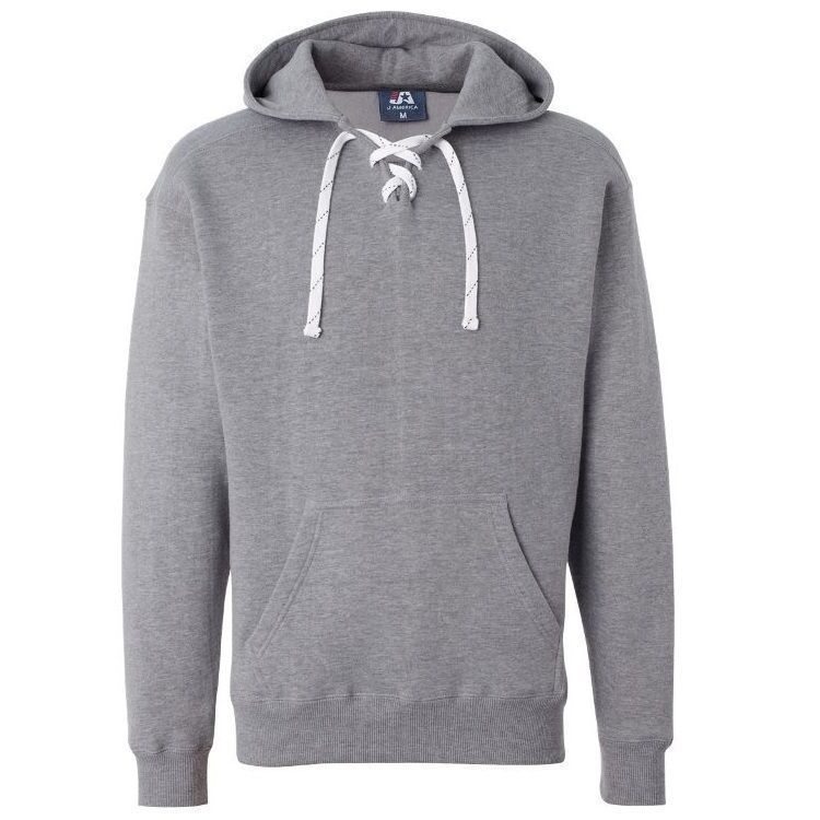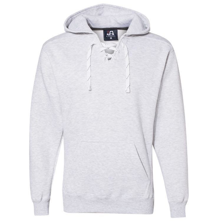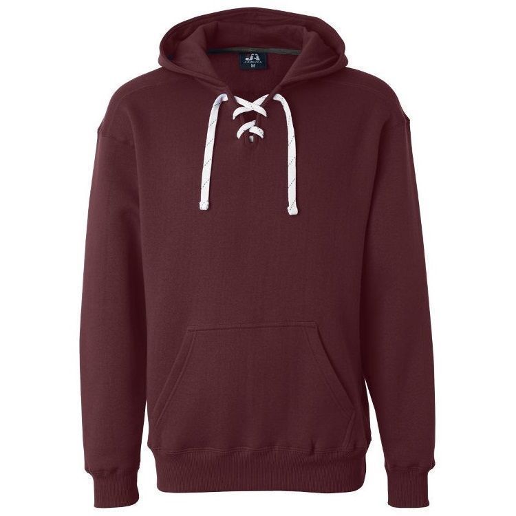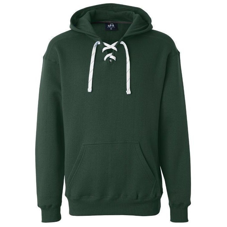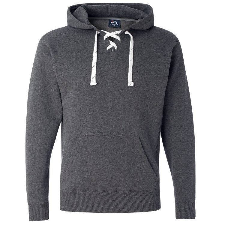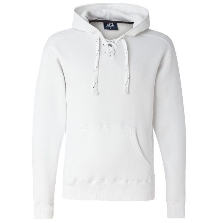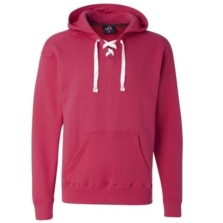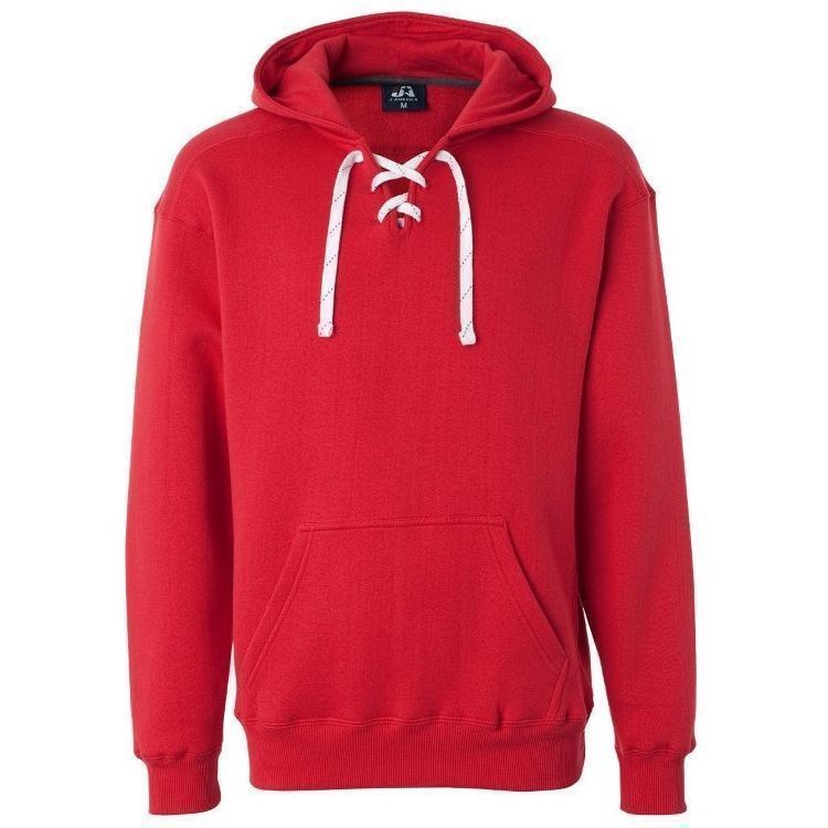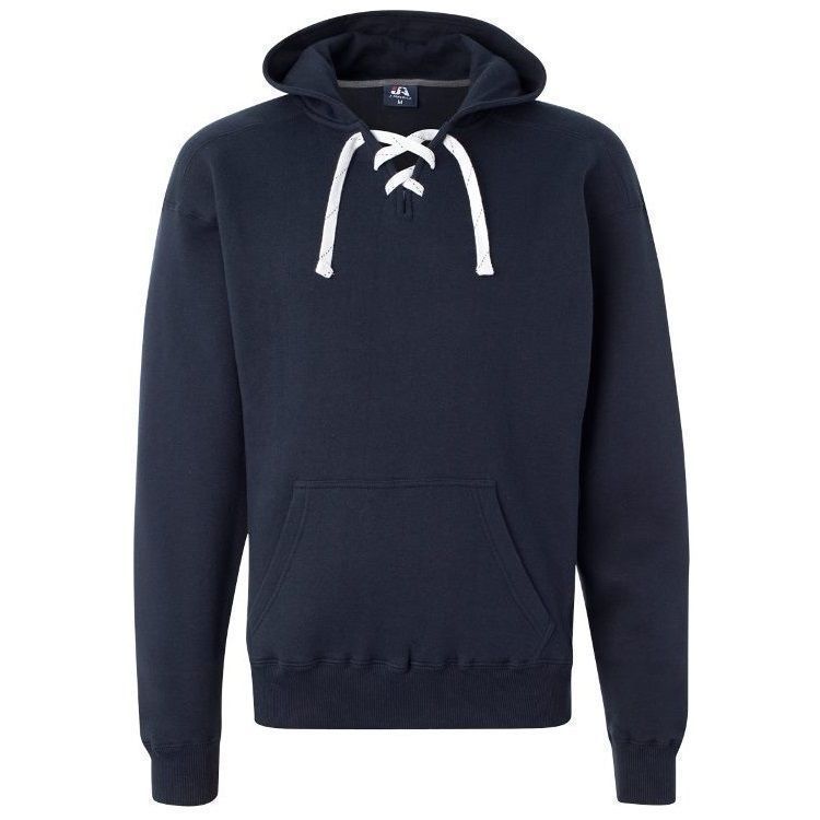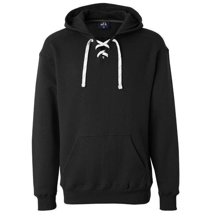 JA8830 heavyweight hockey hoodie features 10 oz. poly cotton ring-spun fabric with a jersey lined hood with trim and 6 sewn eyelets skate lace tie design. JA8830 lace up hockey hoodie features sport shoulder panels, set-in pouch pocket, with 2 inch rib knit cuffs and waist design.