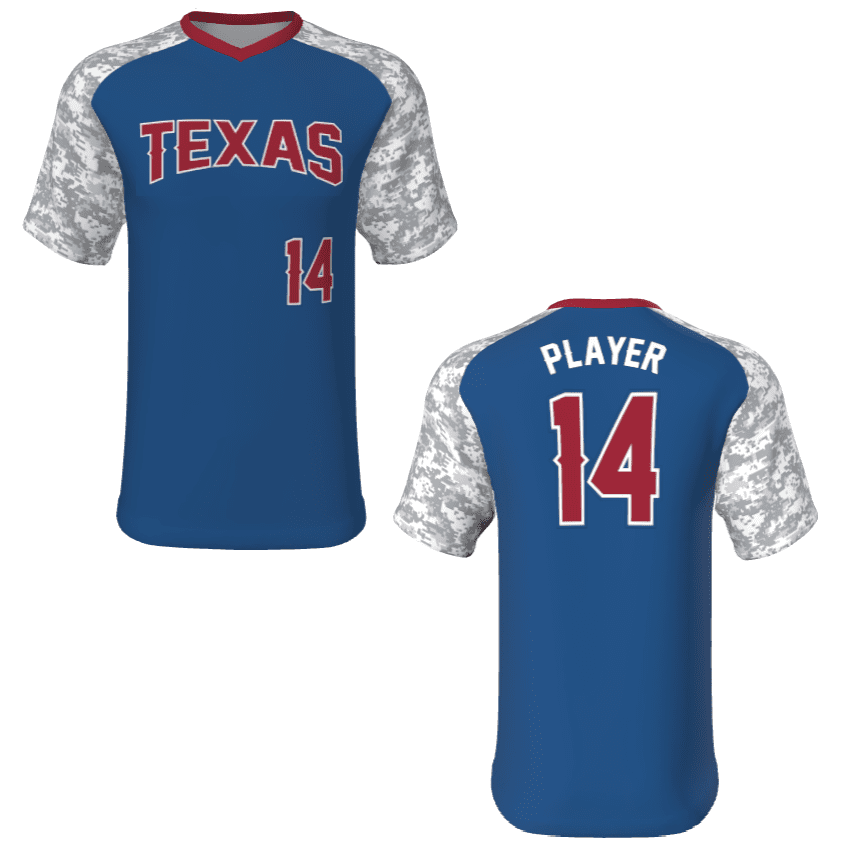 Juice JPL-023 sublimated baseball jerseys for adult and youth teams. Sublimated baseball jerseys are perfect for youth little league through adult leagues. Juice JPL-023 pattern features a solid color body, digital camo sleeves and allows for a front custom logo, front lower left number with player name / number on the back.