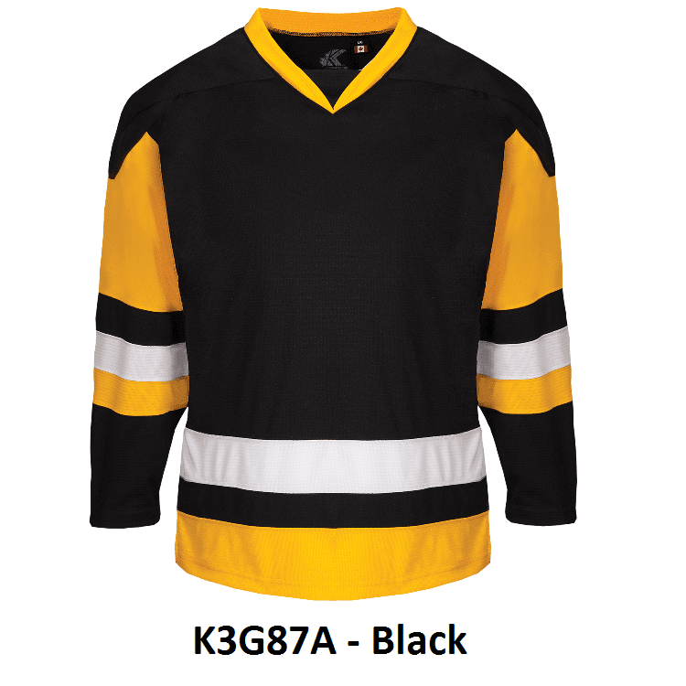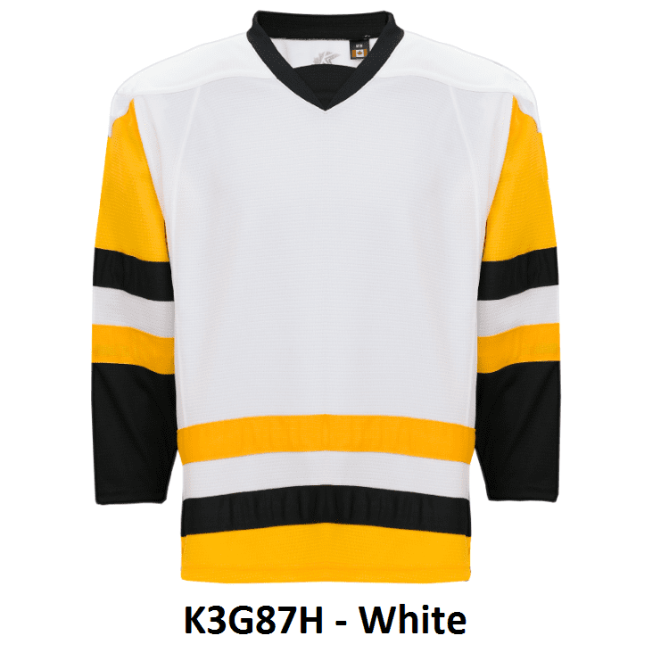 Kobe K3G Pittsburgh Penguins blank hockey jerseys feature pro-weight Kobe K3G air-knit fabric with an authentic 2017 striping pattern. Kobe K3G87A K3G87H Pittsburgh Penguins hockey jerseys also feature double material on the shoulders / elbows, v-necks with inlay and cover-stitched seams. Choose from youth through adult goalie sizes. Made in Canada.