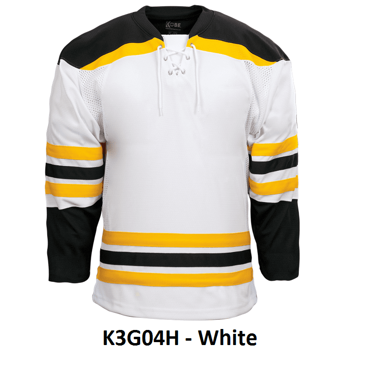 Kobe K3G Boston Bruins blank hockey jerseys feature pro-weight Kobe K3G air-knit fabric with an authentic striping pattern. Kobe K3G04A K3G04H home and away Bruins hockey jerseys also feature double material on the shoulders / elbows, lace up necks, underarm mesh gussets and cover-stitched seams. Choose from youth through adult goalie sizes. Made in Canada.