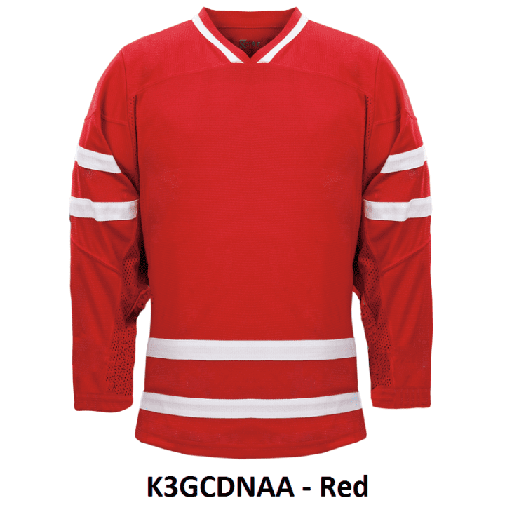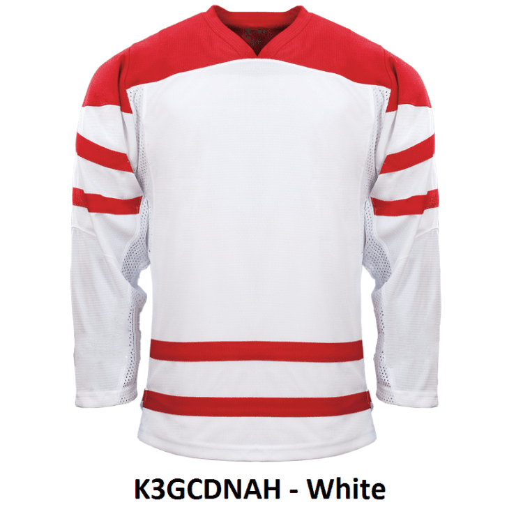 Team Canada blank hockey jerseys feature pro-weight Kobe K3G air-knit fabric with an authentic striping pattern. Kobe K3GCDNAA K3GCDNAH home and away Team Canada hockey jerseys also feature double material on the shoulders / elbows, y-neck with inlay, underarm mesh gussets and cover-stitched seams. Choose from youth through adult goalie sizes. Made in Canada.