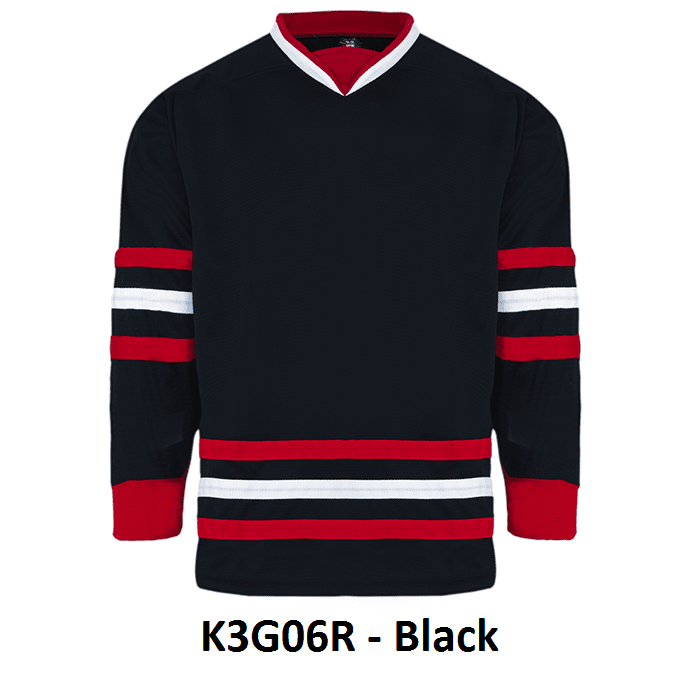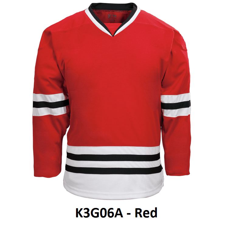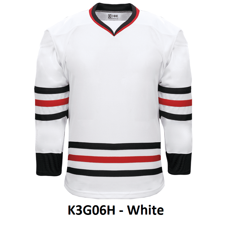 Kobe K3G Chicago Blackhawks blank hockey jerseys feature pro-weight Kobe K3G air-knit fabric with an authentic 2007 striping pattern. Kobe K3G06A K3G06H home and away Blackhawks hockey jerseys also feature double material on the shoulders / elbows, v-necks with inlay and cover-stitched seams. Choose from youth through adult goalie sizes. Made in Canada.