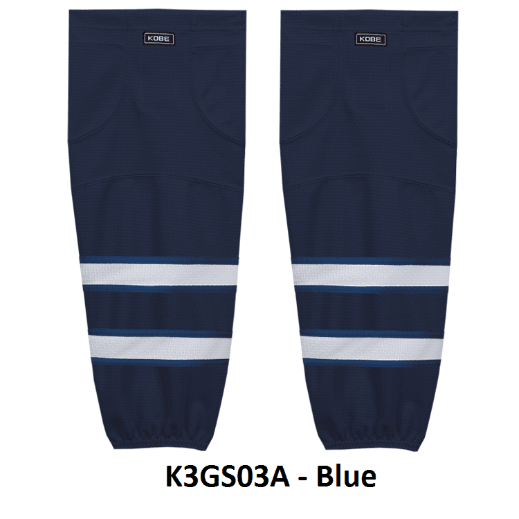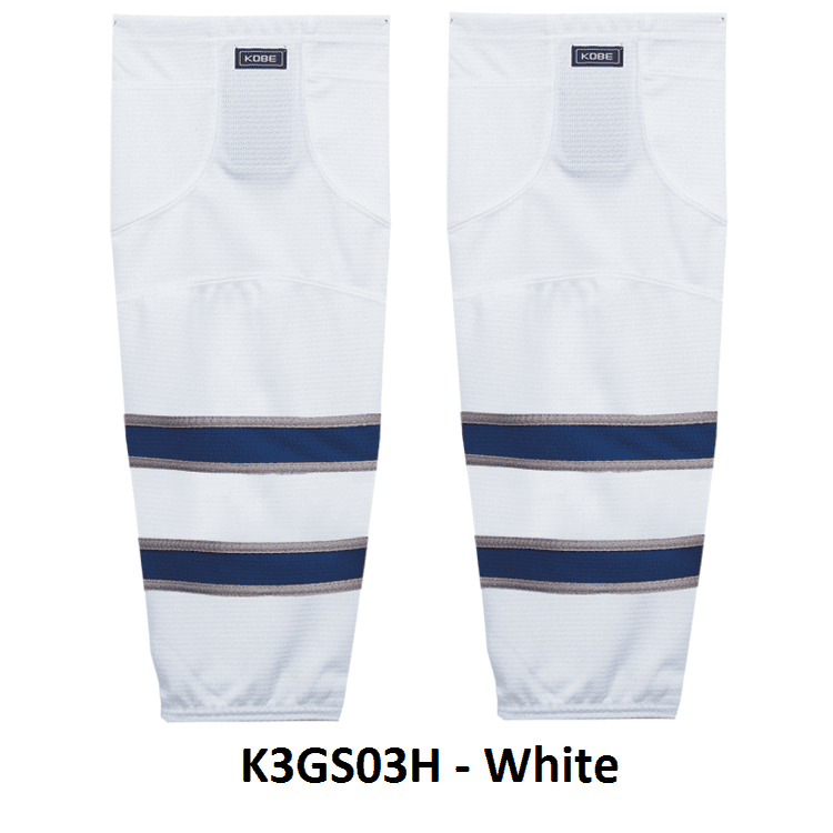 Winnipeg Jets air knit hockey socks in Kobe K3G jersey fabric with velcro tabs and elastic cuffs. Kobe K3GS03 Winnipeg Jets edge mesh hockey socks feature a pro quality ergonomic fit with authentic Winnipeg sewn striping. Choose from adult, intermediate and youth sizes. Made in Canada.