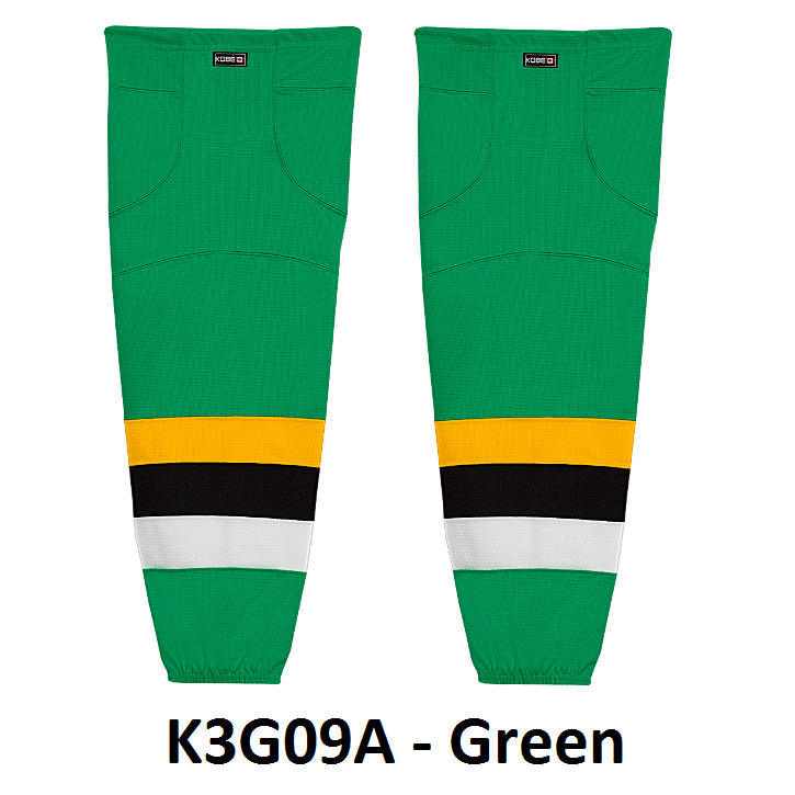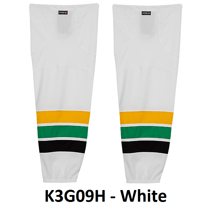 Minnesota North Stars air knit hockey socks in Kobe K3G jersey fabric with velcro tabs and elastic cuffs. Kobe K3GS09 North Stars edge style hockey socks feature a pro quality ergonomic fit with authentic Minnesota sewn striping. Choose from adult, intermediate and youth sizes. Made in Canada.