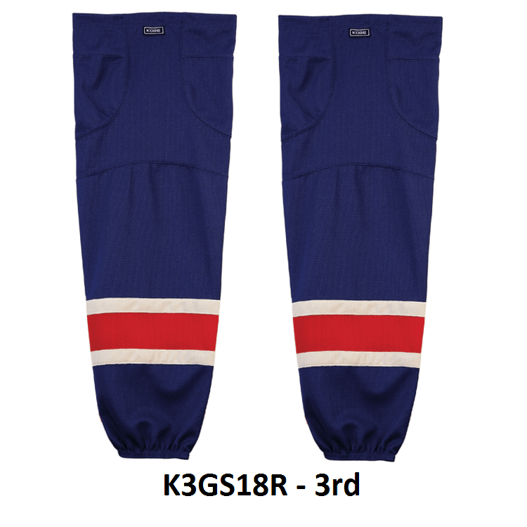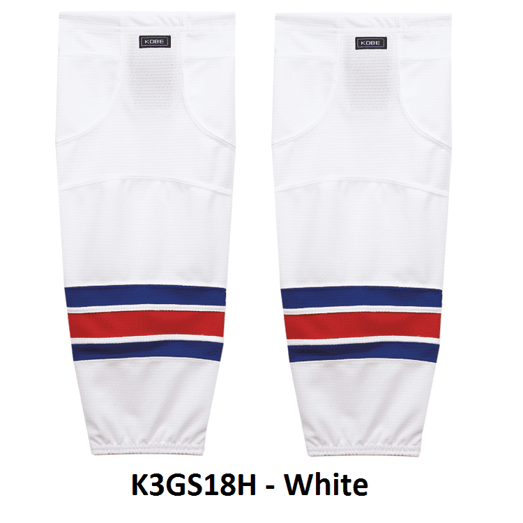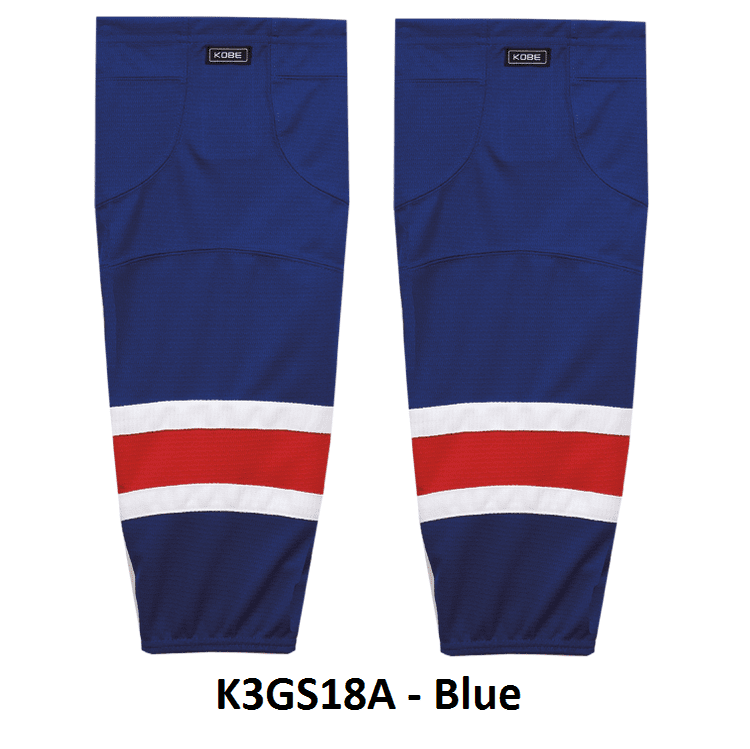 NY Rangers air knit hockey socks in Kobe K3G jersey fabric with velcro tabs and elastic cuffs. Kobe K3GS18 NY Islanders edge mesh hockey socks feature a pro quality ergonomic fit with authentic Rangers sewn striping. Choose from adult, intermediate and youth sizes. Made in Canada.