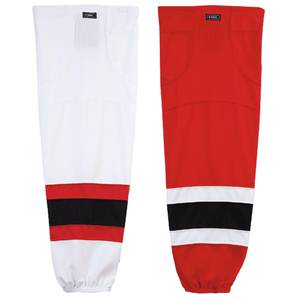 NJ Devils air knit hockey socks in Kobe K3G jersey fabric with velcro tabs and elastic cuffs. Kobe K3GS23 New Jersey Devils edge mesh hockey socks feature a pro quality ergonomic fit with authentic Devils sewn striping. Choose from adult, intermediate and youth sizes. Made in Canada.