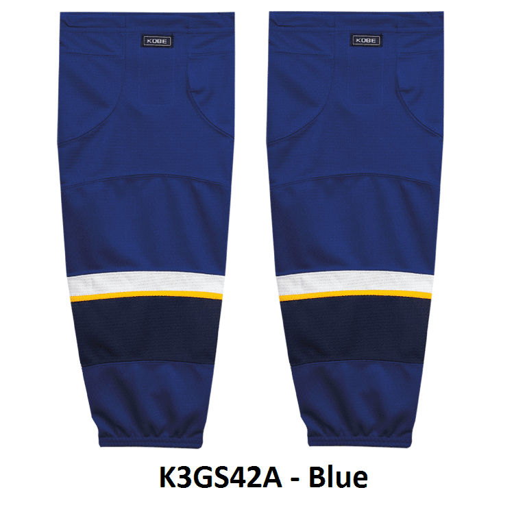 St. Louis Blues air knit hockey socks in Kobe K3G jersey fabric with velcro tabs and elastic cuffs. Kobe K3GS42 Blues edge mesh hockey socks feature a pro quality ergonomic fit with authentic Blues sewn striping. Choose from adult, intermediate and youth sizes. Made in Canada.