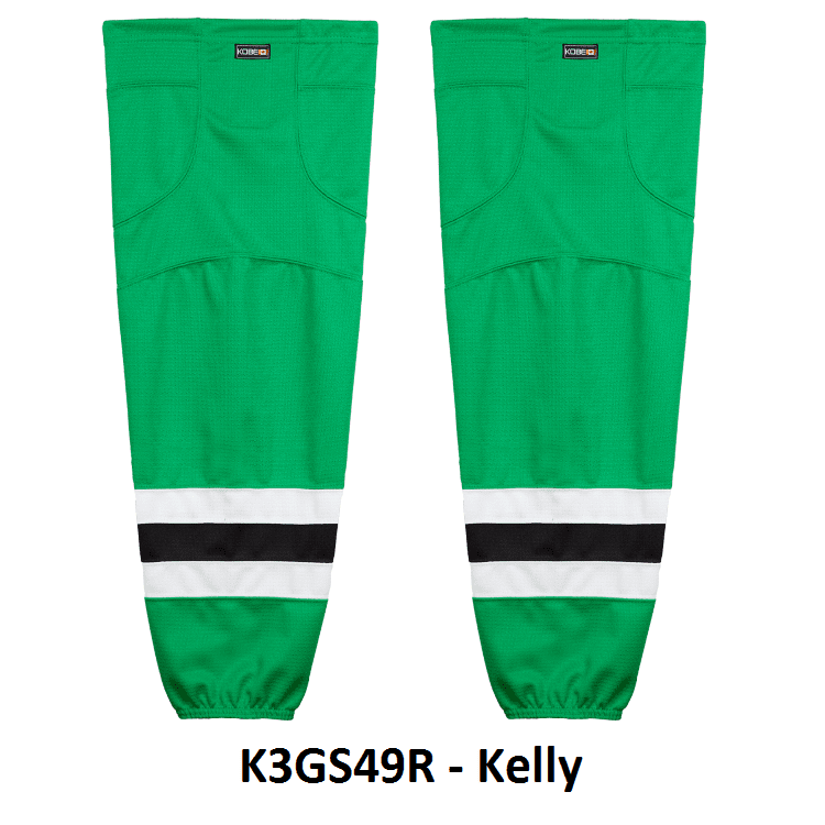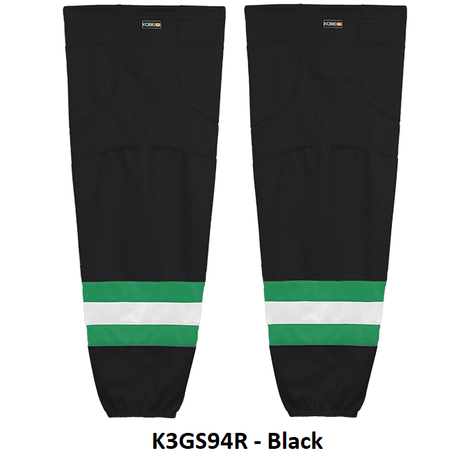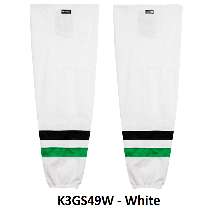 Dallas Stars air knit hockey socks in Kobe K3G jersey fabric with velcro tabs and elastic cuffs. Kobe K3GS49 Dallas Stars edge mesh hockey socks in home, away and 3rd. These socks feature a pro quality ergonomic fit with authentic Dallas sewn striping. Choose from adult, intermediate and youth sizes. Made in Canada.