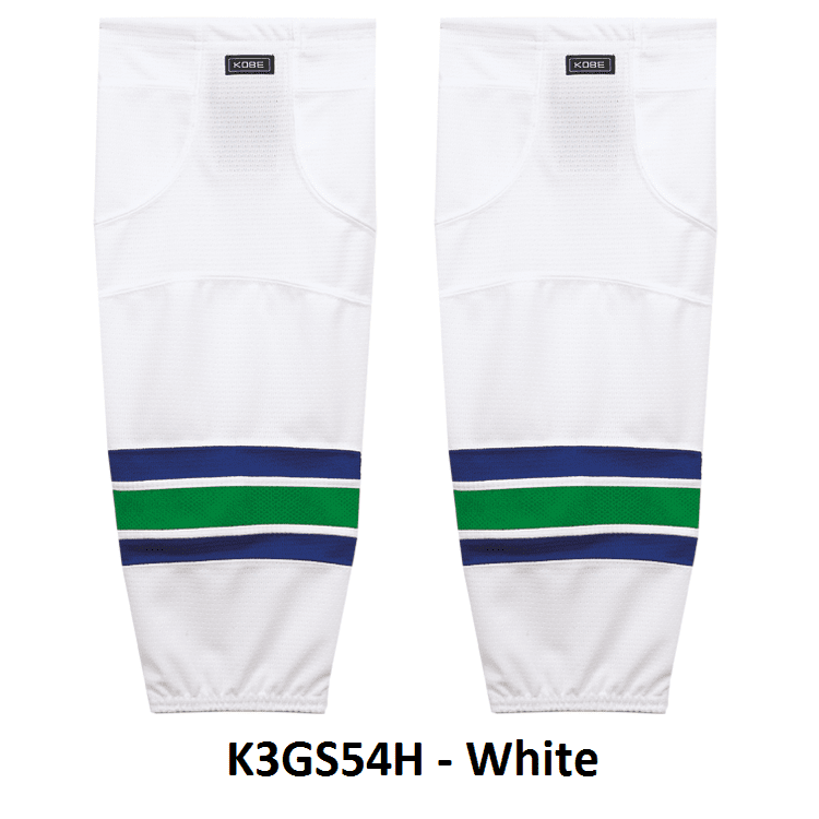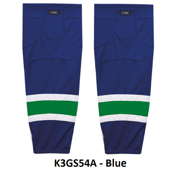 Vancouver Canucks air knit hockey socks in Kobe K3G jersey fabric with velcro tabs and elastic cuffs. Kobe K3GS54 Vancouver Canucks edge mesh hockey socks feature a pro quality ergonomic fit with authentic Canucks sewn striping. Choose from adult, intermediate and youth sizes. Made in Canada.