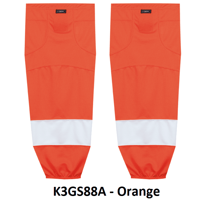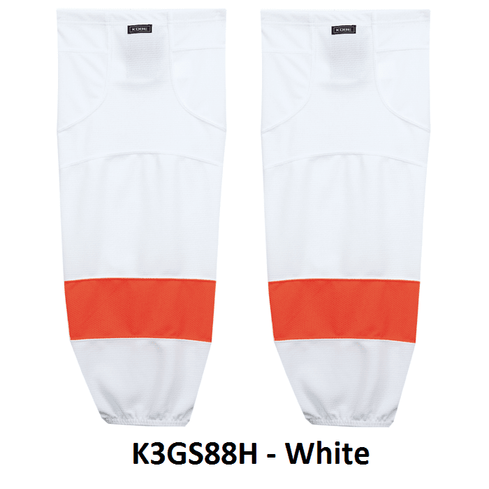 Philadelphia Flyers air knit hockey socks in Kobe K3G jersey fabric with velcro tabs and elastic cuffs. Kobe K3GS88 Philly Flyers edge mesh hockey socks feature a pro quality ergonomic fit with authentic Flyers sewn striping. Choose from adult, intermediate and youth sizes. Made in Canada.