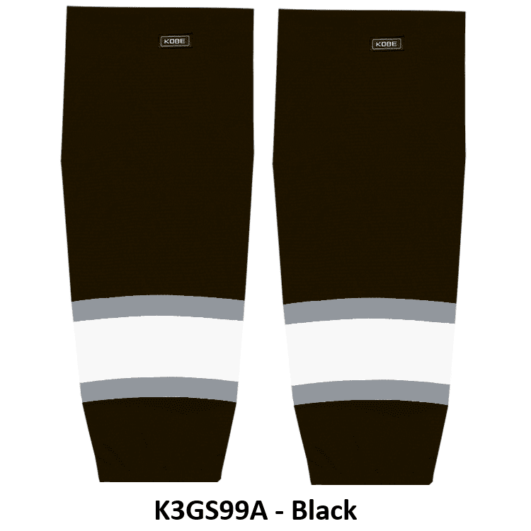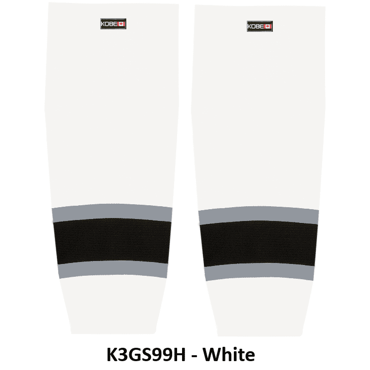 LA Kings air knit hockey socks in Kobe K3G jersey fabric with velcro tabs and elastic cuffs. Kobe K3GS99 LA Kings edge mesh hockey socks feature a pro quality ergonomic fit with authentic 2025 Kings black and grey sewn striping. Choose from adult, intermediate and youth sizes. Made in Canada.