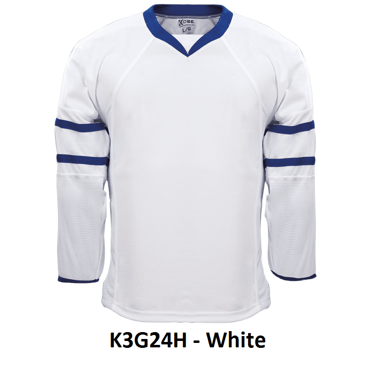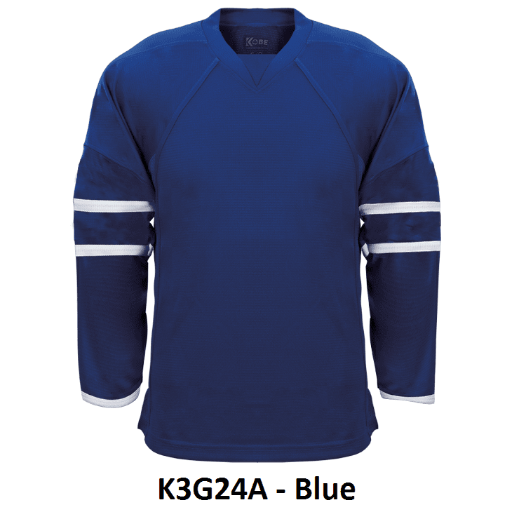 Kobe K3G Toronto Maple Leafs blank hockey jerseys feature pro-weight Kobe K3G air-knit fabric with Maples Leafs old 2007-10 team pattern. Kobe K3G24A K3G24H home and away Toronto Maple Leafs hockey jerseys also feature double material on the shoulders / elbows, V-necks with inlay design and cover-stitched seams. Choose from youth through adult goalie sizes. Made in Canada.