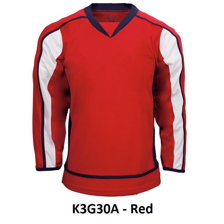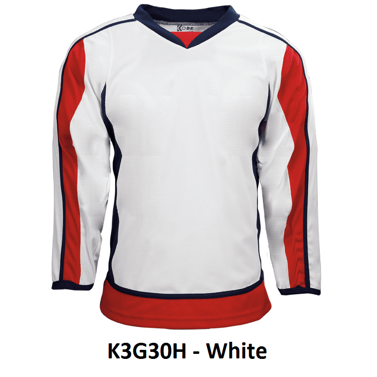 Kobe K3G Washington Capitals blank hockey jerseys feature pro-weight Kobe K3G air-knit fabric with an authentic striping pattern. Kobe K3G30A K3G30H home and away Washington Capitals hockey jerseys also feature double material on the shoulders / elbows, v-necks with inlay, underarm mesh gussets and cover-stitched seams. Choose from youth through adult goalie sizes. Made in Canada.