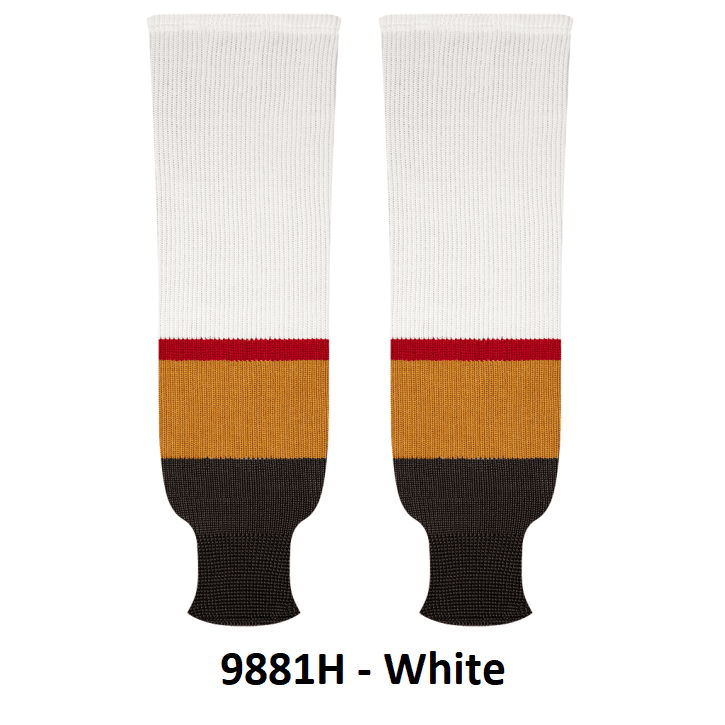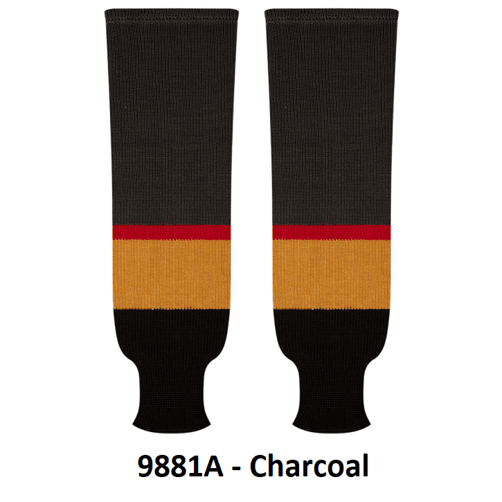 Kobe Vegas Golden Knights hockey socks in home and away charcoal grey styles. Vegas Knights knit hockey socks in stock in adult, intermediate and youth sizes in authentic Knights team charcoal grey and white stripes. Kobe knit hockey socks feature a 65% cotton / 35% polyester blended fabric. Made in Canada.
