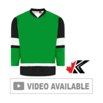 Kobe 5200 House League Hockey Jersey in league weight air-knit fabric with single reinforced shoulders and elbows, K3G style v-neck with inlay, contrast upper sleeve inserts, dual stripes on sleeves and bottom. Kobe 5200 series jerseys have rounded bottom hems. Made in Canada. Youth XS through adult goalie sizes.