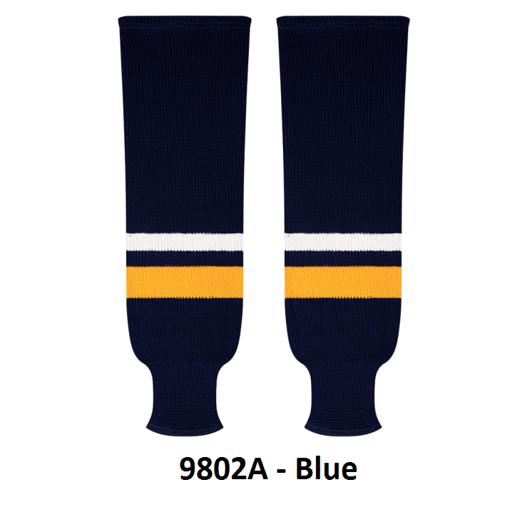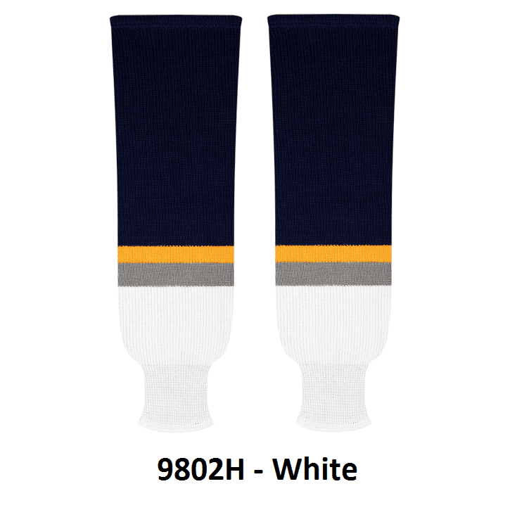 Kobe Buffalo Sabres hockey socks in home and away styles. Buffalo Sabres knit hockey socks in stock in adult, intermediate and youth sizes in authentic Sabres navy, gold and white stripes. Kobe knit hockey socks feature a 65% cotton / 35% polyester blended fabric. Made in Canada.