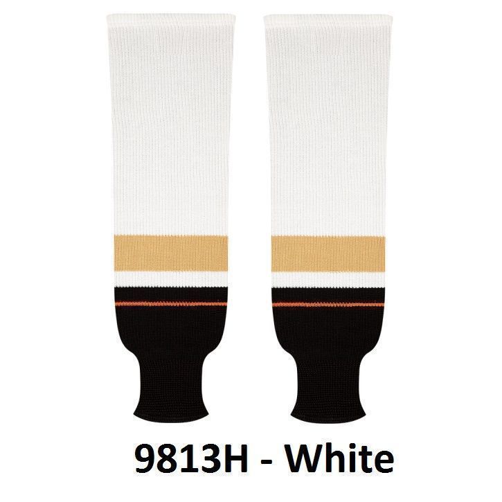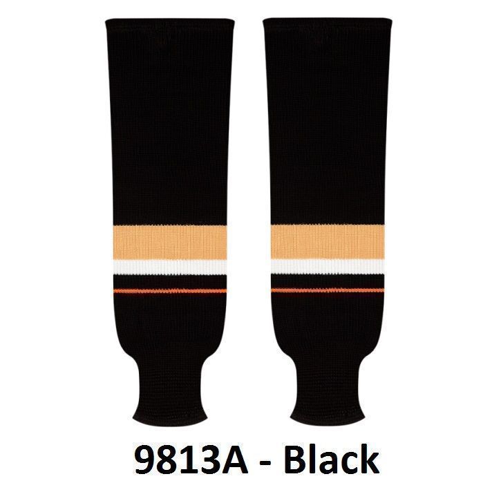 Kobe Anaheim Ducks hockey socks in home and away styles. Anaheim Ducks knit hockey socks in stock in adult, intermediate and youth sizes in authentic Ducks black, vegas and white stripes. Kobe knit hockey socks feature a 65% cotton / 35% polyester blended fabric. Made in Canada.