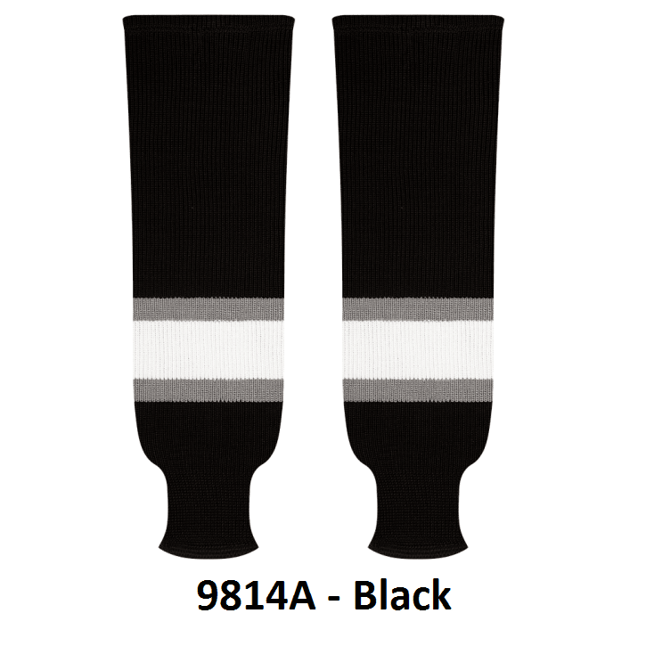 Kobe Los Angeles Kings hockey socks in old home away styles. Los Angeles Kings old hockey socks in stock in adult, intermediate and youth sizes in authentic Kings team black, grey and white stripes. Kobe knit hockey socks feature a 65% cotton / 35% polyester blended fabric. Made in Canada.