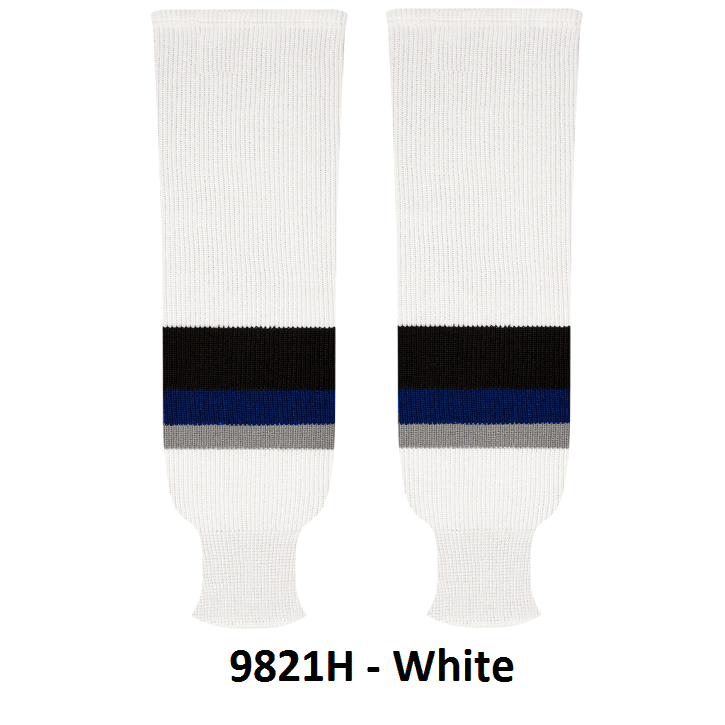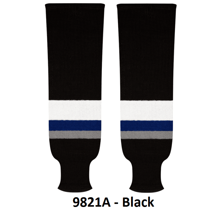 Kobe Tampa Bay Lightning hockey socks in home and away styles. Tampa Bay Lightning knit hockey socks in stock in adult, intermediate and youth sizes in authentic Lightning team blue, black and white stripes. Kobe knit hockey socks feature a 65% cotton / 35% polyester blended fabric. Made in Canada.