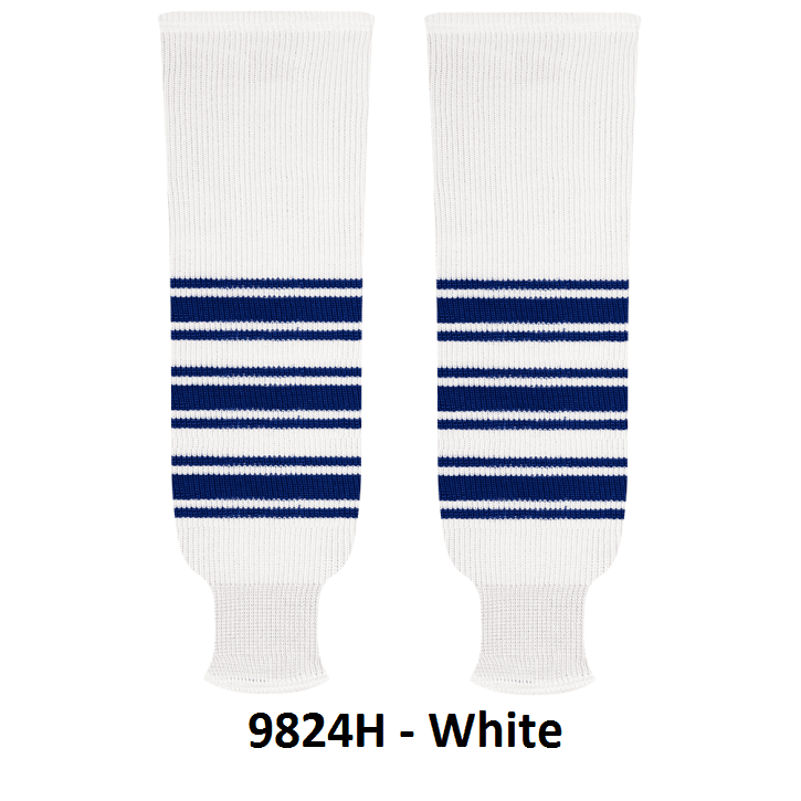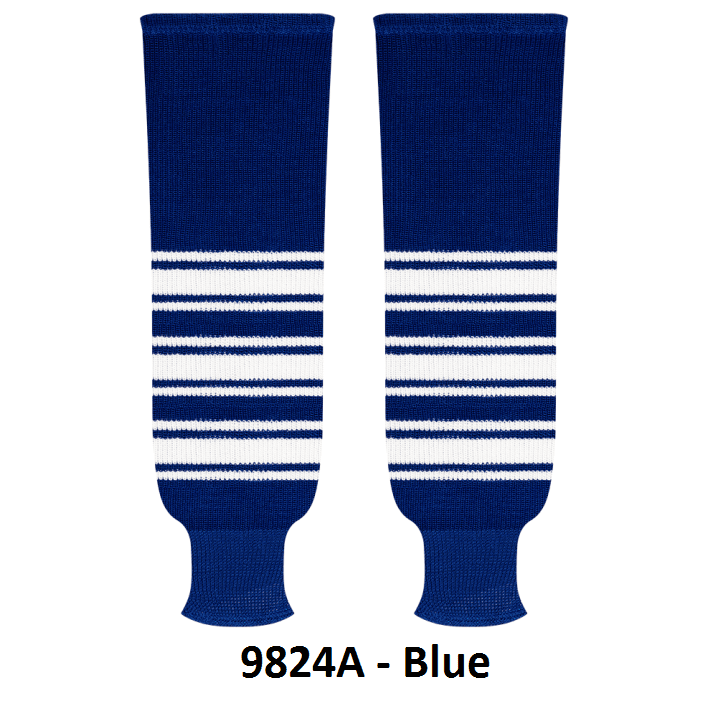 Kobe Toronto Maple Leafs hockey socks in home and away styles. Toronto Maple Leafs knit hockey socks in stock in adult, intermediate and youth sizes in authentic Maple Leafs team blue and white stripes. Kobe knit hockey socks feature a 65% cotton / 35% polyester blended fabric. Made in Canada.
