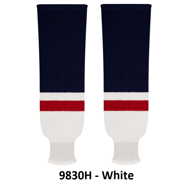 Kobe Washington Capitals hockey socks in home and away styles. Washington Capitals knit hockey socks in stock in adult, intermediate and youth sizes in authentic Capitals blue, red and white team stripe pattern. Kobe knit hockey socks feature a 65% cotton / 35% polyester blended fabric. Made in Canada.