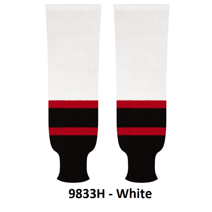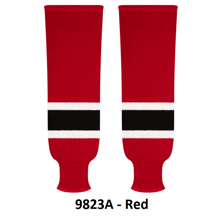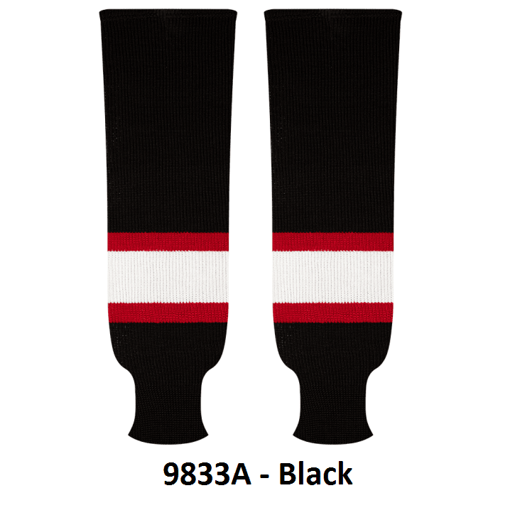 Kobe Ottawa Senators hockey socks in home, away and 3rd red striped patterns. Ottawa Senators knit hockey socks in stock in adult, intermediate and youth sizes in authentic Senators team red, white & black stripes. Kobe knit hockey socks feature a 65% cotton / 35% polyester blended fabric. Made in Canada.
