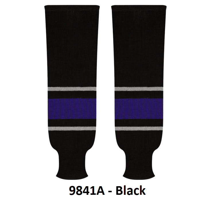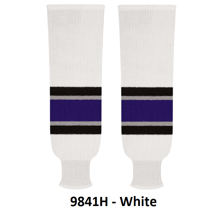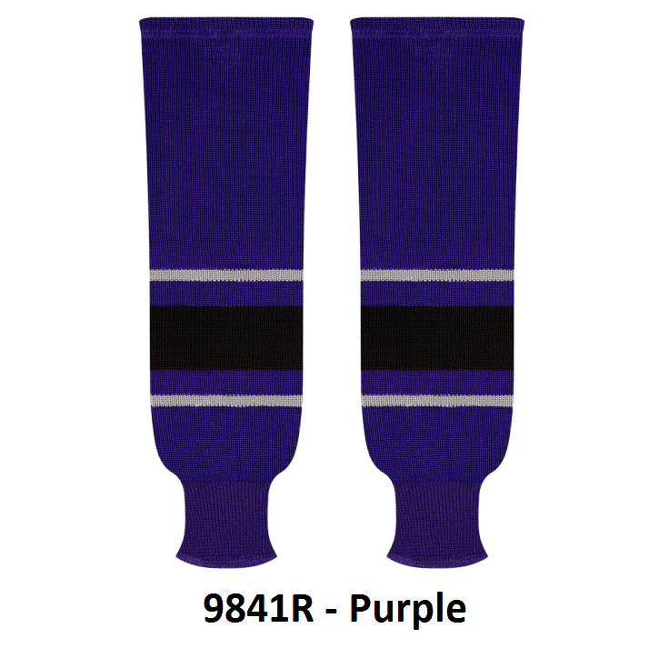 Kobe Los Angeles Kings hockey socks in home, away and 3rd styles. Los Angeles Kings knit hockey socks in stock in adult, intermediate and youth sizes in authentic Kings team purple, grey, black and white stripes. Kobe knit hockey socks feature a 65% cotton / 35% polyester blended fabric. Made in Canada.