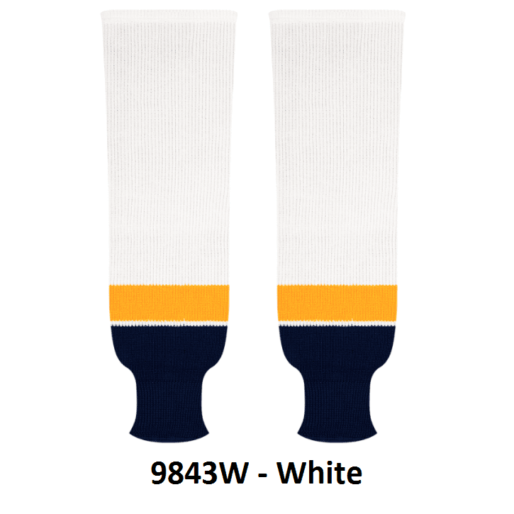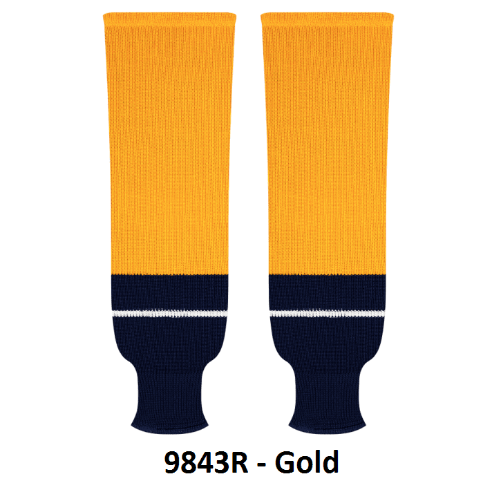Kobe Nashville Predators hockey socks in home and away 2017 pattern styles. Nashville Predators knit hockey socks in stock in adult, intermediate and youth sizes in authentic Predators team navy, gold and white stripes. Kobe knit hockey socks feature a 65% cotton / 35% polyester blended fabric. Made in Canada.