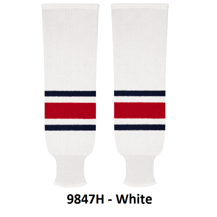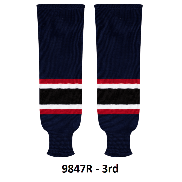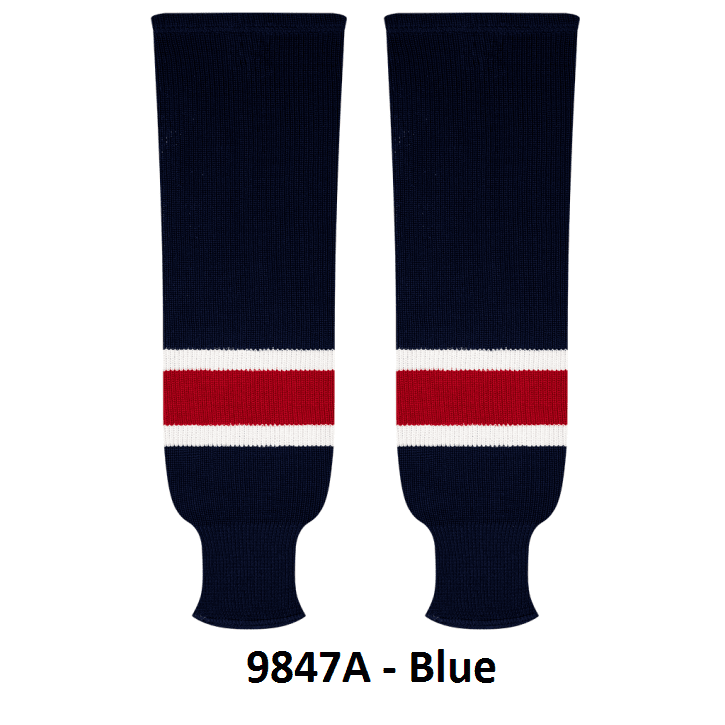 Kobe Columbus Blue Jackets hockey socks in home, away and 3rd styles. Columbus Blue Jackets knit hockey socks in stock in adult, intermediate and youth sizes in authentic Blue Jackets team stripes. Kobe knit hockey socks feature a 65% cotton / 35% polyester blended fabric. Made in Canada.