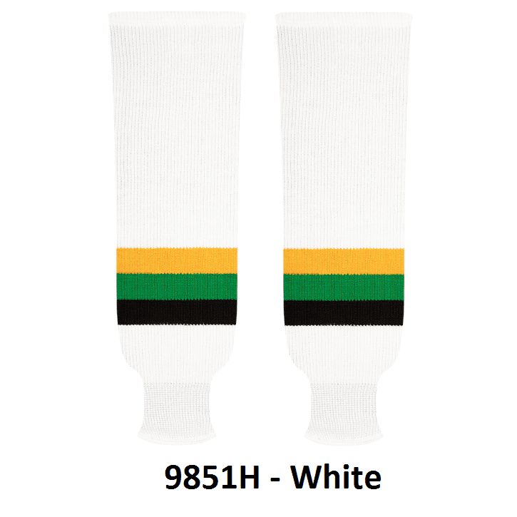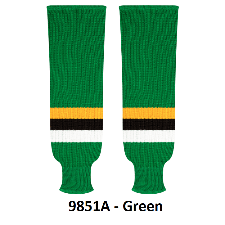 Minnesota North Stars hockey socks in home and away styles. North Stars knit hockey socks in stock in adult, intermediate and youth sizes in authentic Stars kelly green, black, gold and white stripes. Kobe knit hockey socks feature a 65% cotton / 35% polyester blended fabric. Made in Canada.