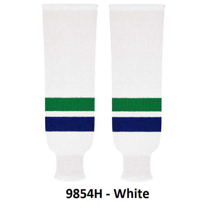 Kobe Vancouver Canucks hockey socks in home and away styles. Vancouver Canucks knit hockey socks in stock in adult, intermediate and youth sizes in authentic Canucks team blue, green and white stripes. Kobe knit hockey socks feature a 65% cotton / 35% polyester blended fabric. Made in Canada.