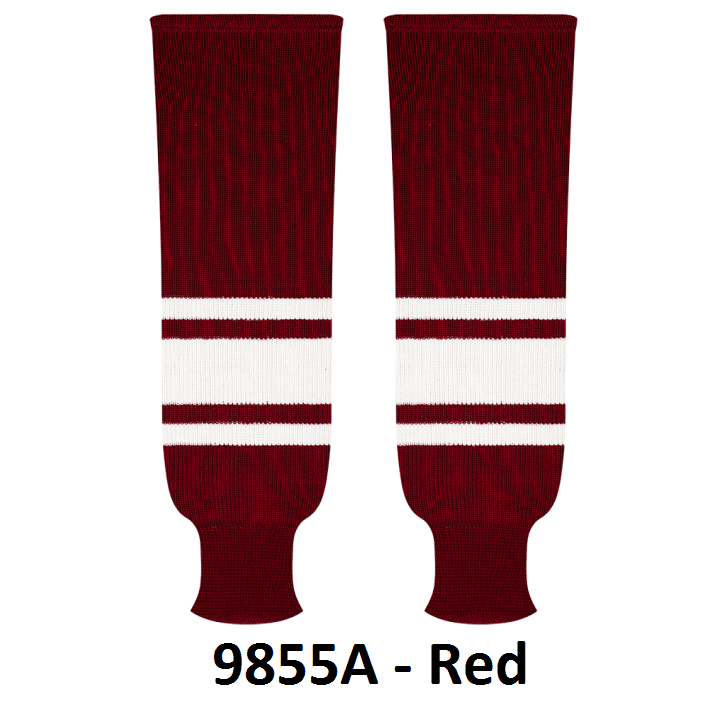 Kobe Phoenix Coyotes hockey socks in home and away styles. Phoenix Coyotes knit hockey socks in stock in adult, intermediate and youth sizes in authentic Coyotes cardinal and white stripes. Kobe knit hockey socks feature a 65% cotton / 35% polyester blended fabric. Made in Canada.