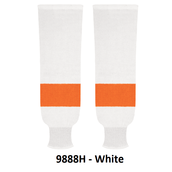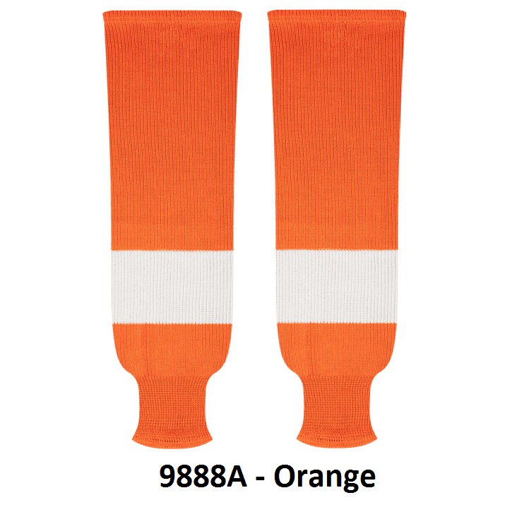 Kobe Philadelphia Flyers hockey socks in home and away new orange styles. Philadelphia Flyers knit hockey socks in stock in adult, intermediate and youth sizes in authentic Flyers team pale orange and white stripes. Kobe knit hockey socks feature a 65% cotton / 35% polyester blended fabric. Made in Canada.
