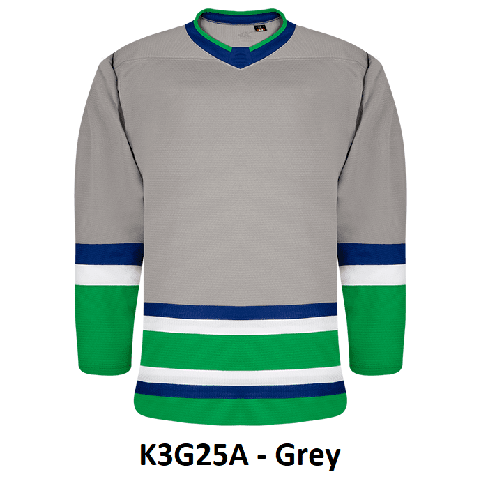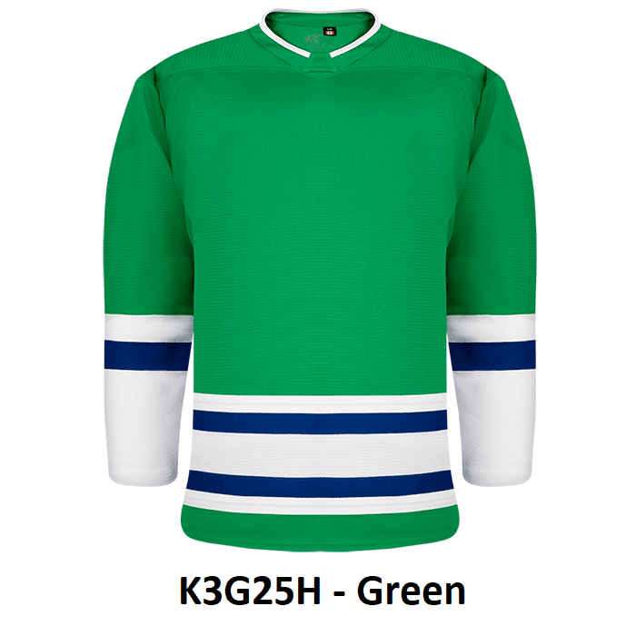 Kobe K3G Hartford Whalers blank hockey jerseys feature pro-weight Kobe K3G air-knit fabric with an authentic reverse retro striping pattern. Kobe K3G25A K3G25H home and away Whalers hockey jerseys also feature double material on the shoulders / elbows, edge necks and cover-stitched seams. Choose from youth through adult goalie sizes. Made in Canada.