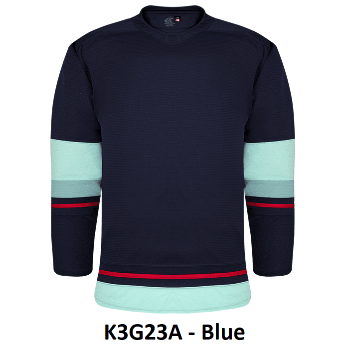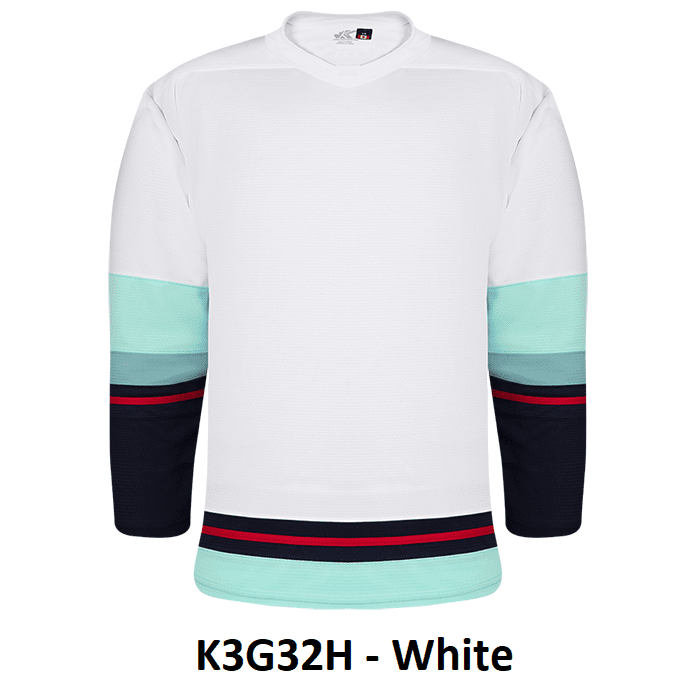 Kobe K3G Seattle Kraken blank hockey jerseys feature pro-weight Kobe K3G air-knit fabric with authentic 2022 striping pattern. Kobe K3G32A K3G332H home away Kraken hockey jerseys also feature double material on the shoulders / elbows, edge necks and cover-stitched seams. Choose from youth through adult goalie sizes. Made in Canada.