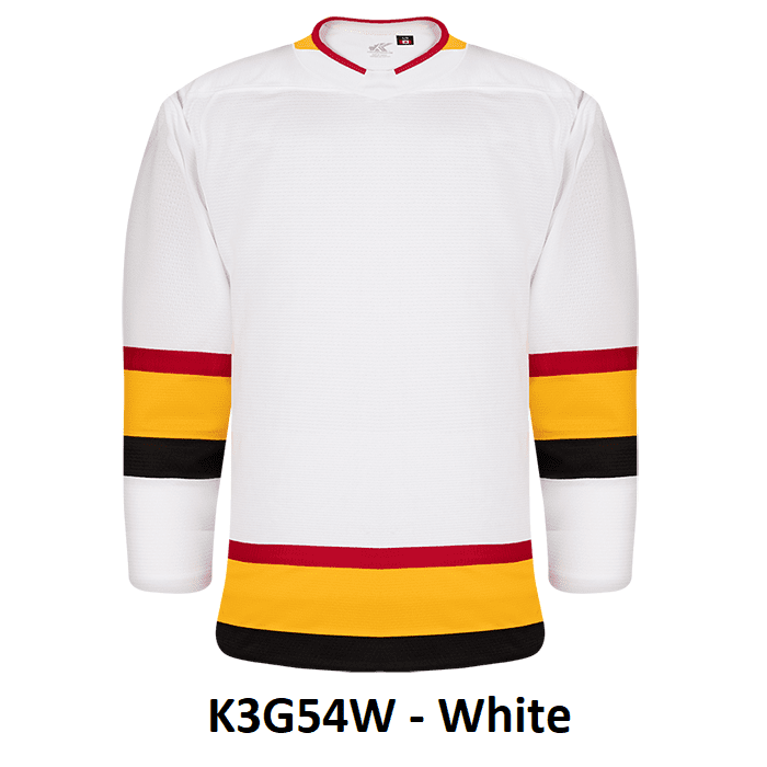 Kobe K3G Vancouver Canucks blank hockey jerseys feature pro-weight Kobe K3G air-knit fabric with an authentic vintage striping pattern. Kobe K3G54R K3G54W home and away Vancouver Canucks hockey jerseys also feature double material on the shoulders / elbows, edge necks and cover-stitched seams. Choose from youth through adult goalie sizes. Made in Canada.