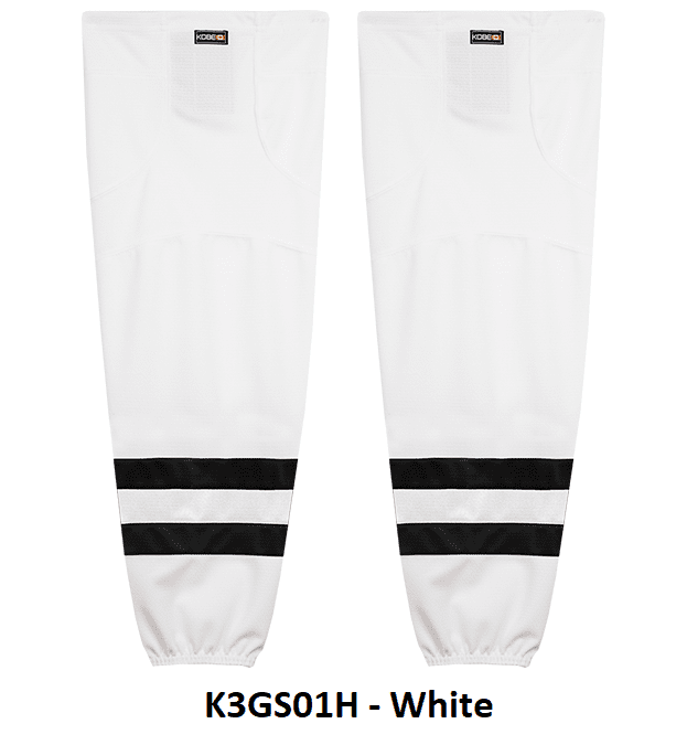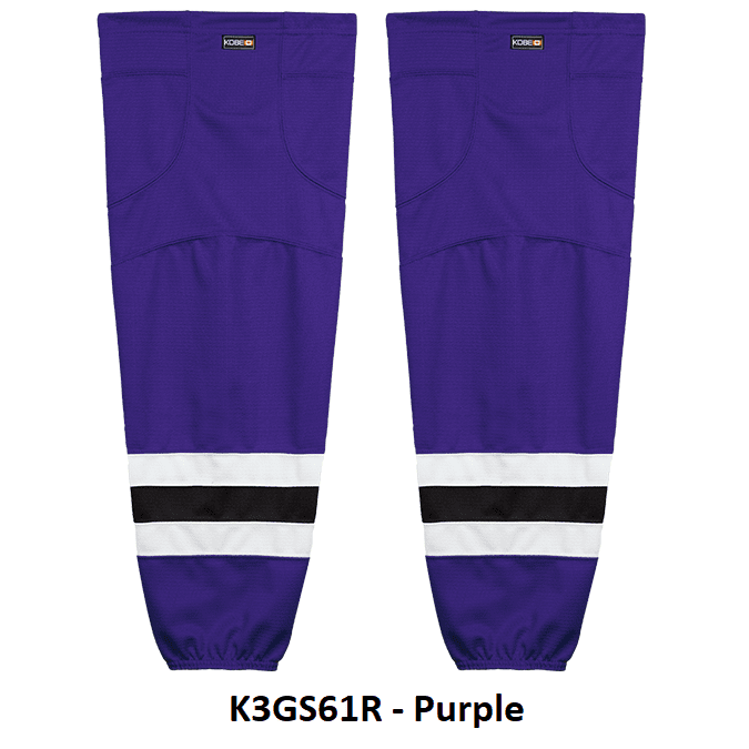 LA Kings air knit hockey socks in Kobe K3G jersey fabric with velcro tabs and elastic cuffs. Kobe K3GS61R Kings edge style hockey socks feature a pro quality ergonomic fit with authentic LA Kings sewn striping. Choose from adult, intermediate and youth sizes. Made in Canada.