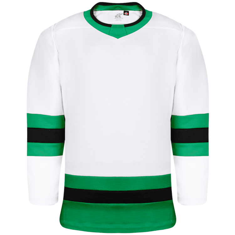 Kobe K3GLDAL blank hockey jerseys feature pro weight Kobe K3G air-knit fabric with Dallas Stars team colors. Kobe K3GLDAL home, away and 3rd black league hockey jerseys also feature single material on the shoulders / elbows, K3G crew neck with inlay, and double needle stitching. Choose from youth through adult goalie sizes.